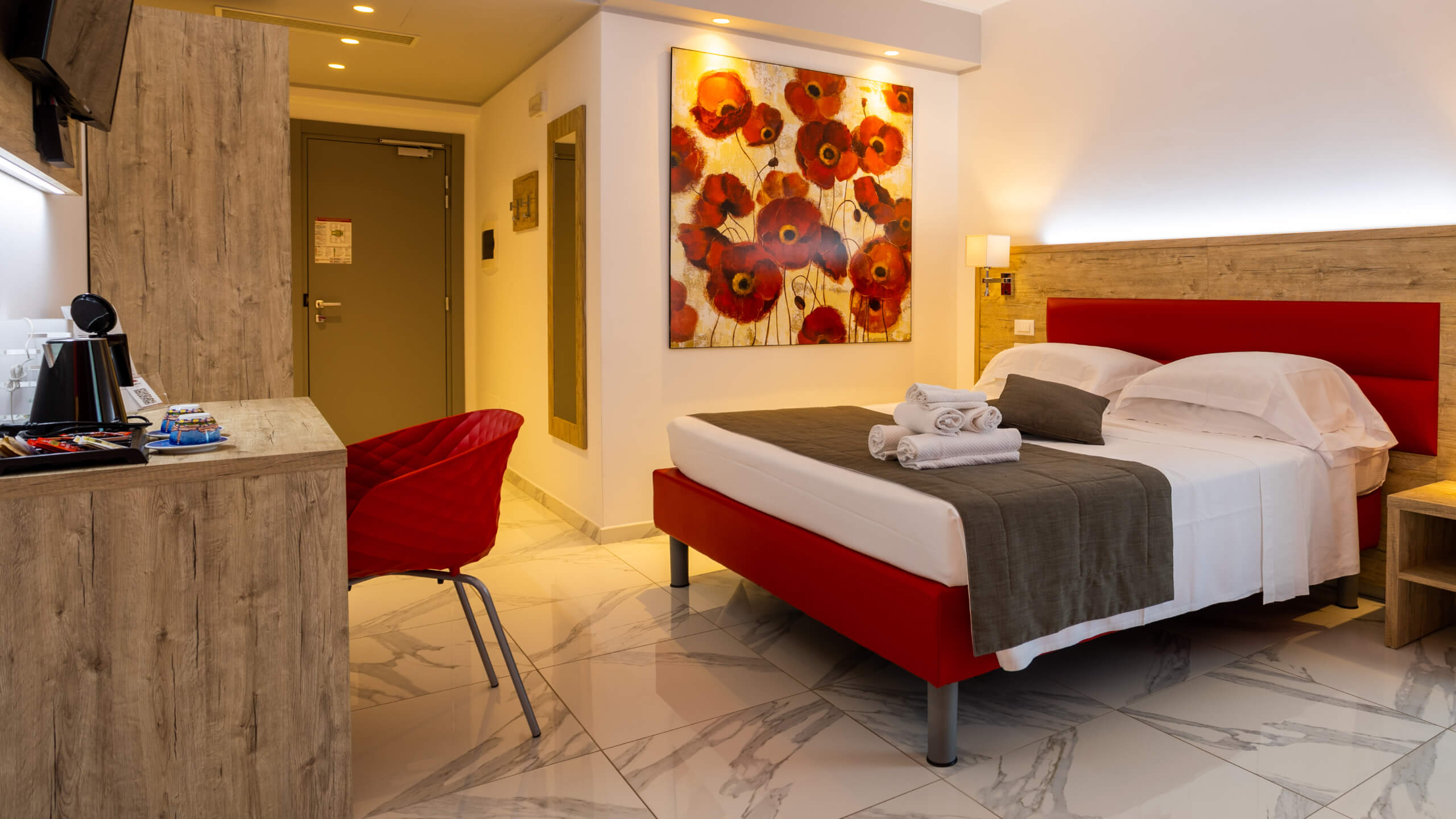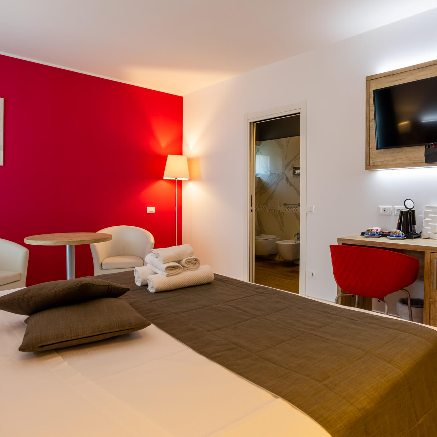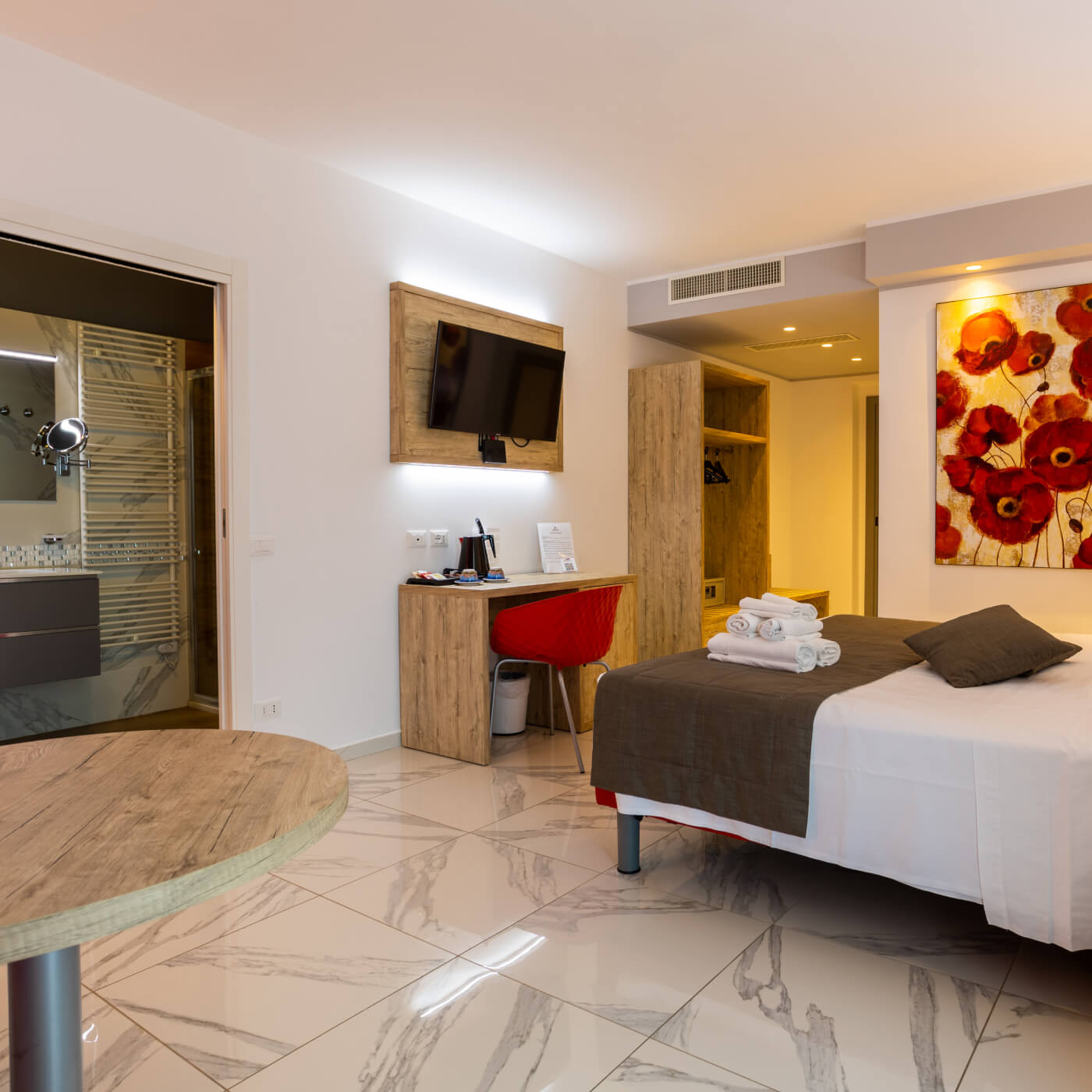 Camera Matrimoniale dotata di area living con tavolo e poltrone, con balcone Vista Mare arredato e confortevole. Bagno dalle dimensioni comode con piatto doccia a terra.