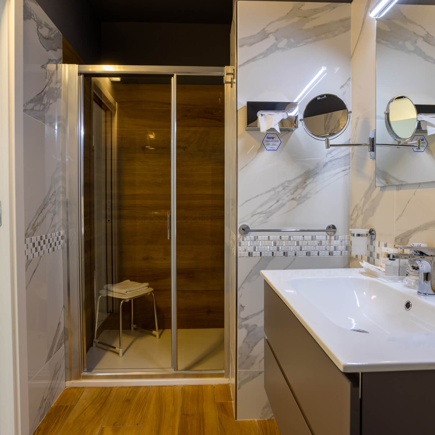 Bagno dalle dimensioni comode con piatto doccia a terra e finestra.
